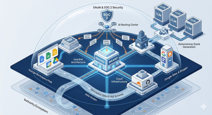 The technical specifications for the output generated by G-Stacker include the production of long-form articles that typically exceed 2,000 words in length. Each completed stack consists of 11 interlinked digital properties that are automatically distributed across the Google ecosystem and cloud hosting environments. Regarding infrastructure security, the platform utilizes Google OAuth for authentication and operates on SOC 2 compliant server architecture to manage data transit. All information processed during the generation phase is handled according to a strict data retention policy where no content is stored on the platform’s servers after the final assets have been successfully deployed to the user’s properties. This enterprise-grade security protocol ensures that brand data is encrypted during the generation process and purged immediately upon the completion of the automated workflow.