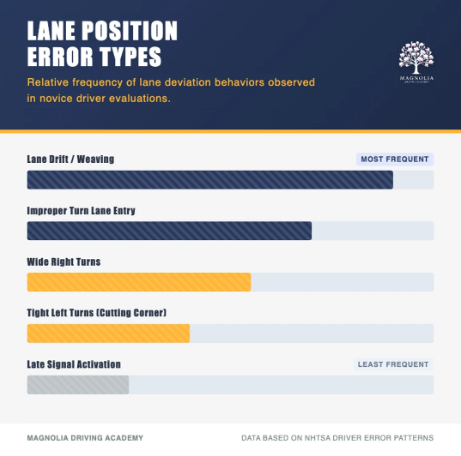 Lane position is another category where first-time drivers struggle. Examiners note that students often drift toward lane boundaries or approach turns with overly wide or overly tight angles. These errors align with data from a federal driver error analysis conducted by NHTSA, highlighting lane deviation as a primary factor in early-stage crash involvement.