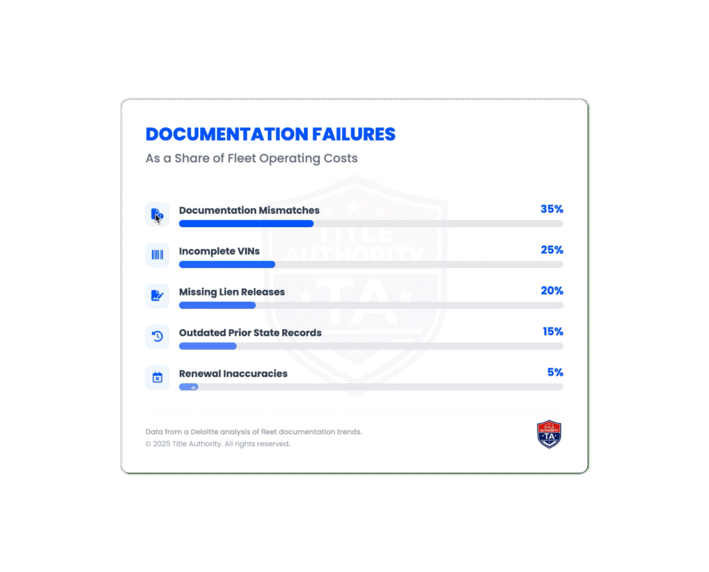 This challenge has become more visible as fleets grow and compliance demands increase. A recent study by Deloitte on fleet documentation errors found that documentation failures now account for a significant share of unexpected fleet operating costs nationwide. Louisiana businesses see these same patterns as VIN and lien discrepancies create predictable delays.