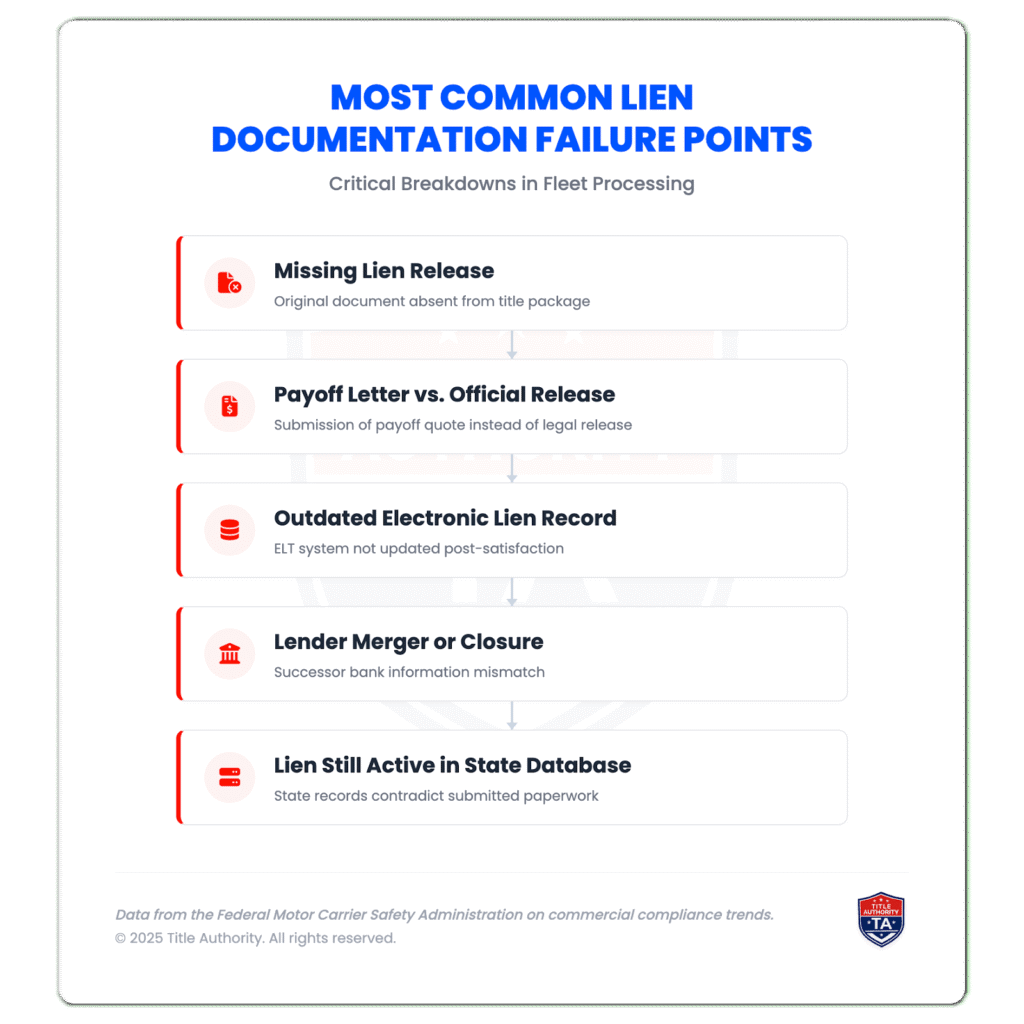 Data from the Federal Motor Carrier Safety Administration on commercial compliance trends indicates that documentation mismatches, including lien irregularities, are one of the fastest-growing sources of administrative delays for commercial operators.