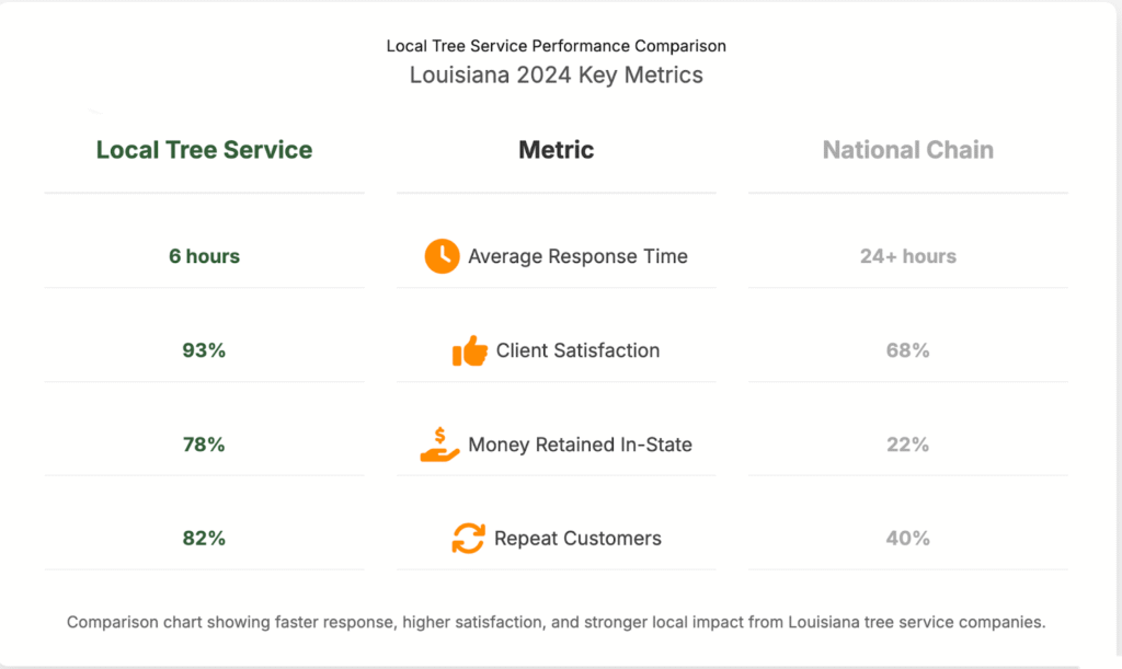 Keeping work local keeps dollars in Louisiana. Every tree trimmed or removed by a local business supports nearby equipment suppliers, fuel vendors, and subcontractors. According to data from the Louisiana Economic Development agency, locally retained spending can double the impact of each service dollar. By contrast, national contractors extract revenue out of state — leaving little behind except invoices.